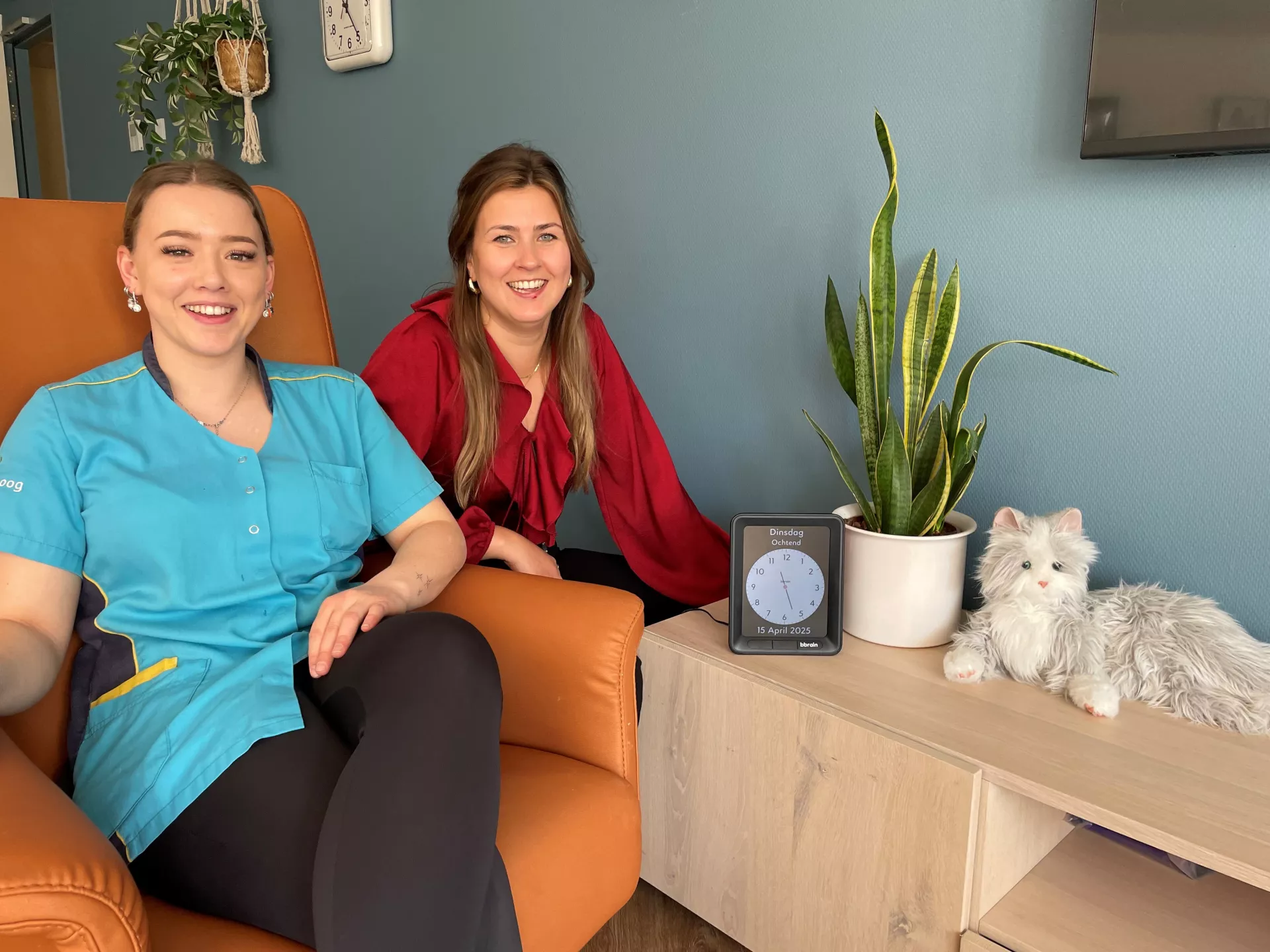 Verzorgende IG Kim en regieverpleegkundige en ambassadeur zorgtechnologie Anne gingen op zoek naar een manier om mevrouw De Jong te ondersteunen, zonder haar zelfstandigheid af te nemen. Kim kende vanuit haar stage bij locatie Reestoord zorgrobot Tessa al: een “pratende bloempot” die ouderen helpt met dagstructuur. Maar voor mevrouw De Jong kwam de tip om eens de Bbrain te proberen, een kalenderklok die tegen je praat.