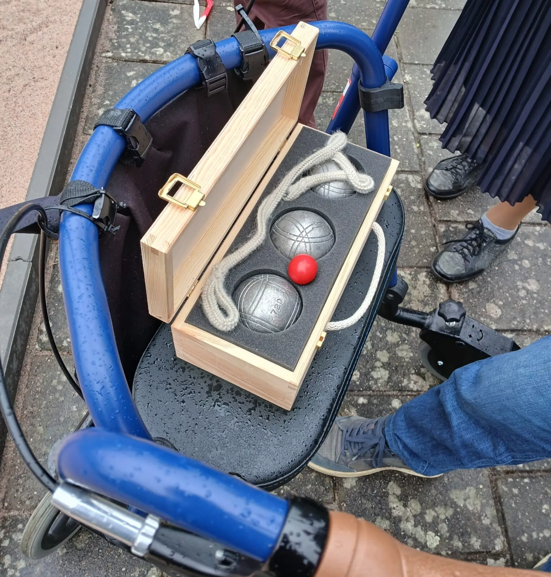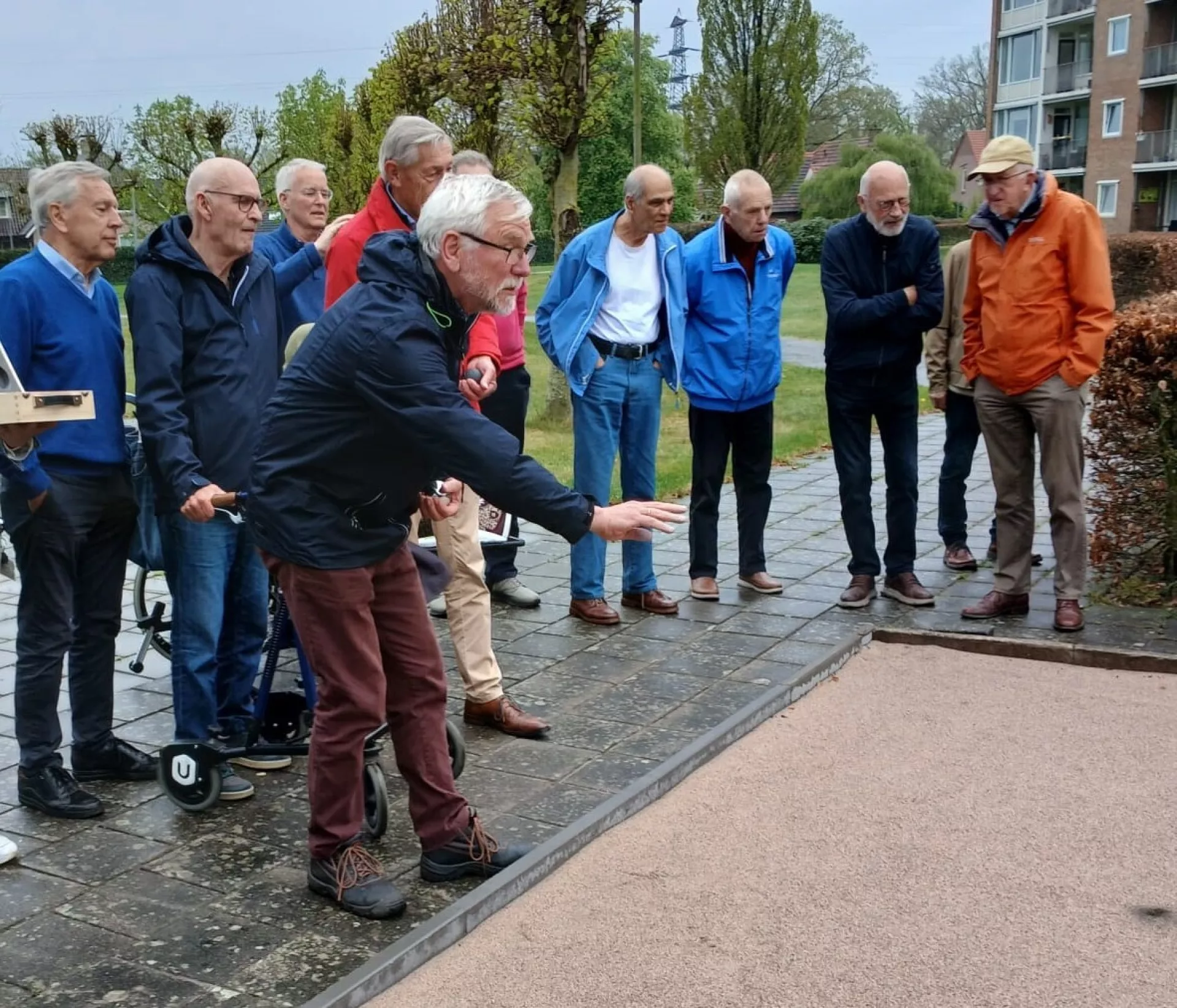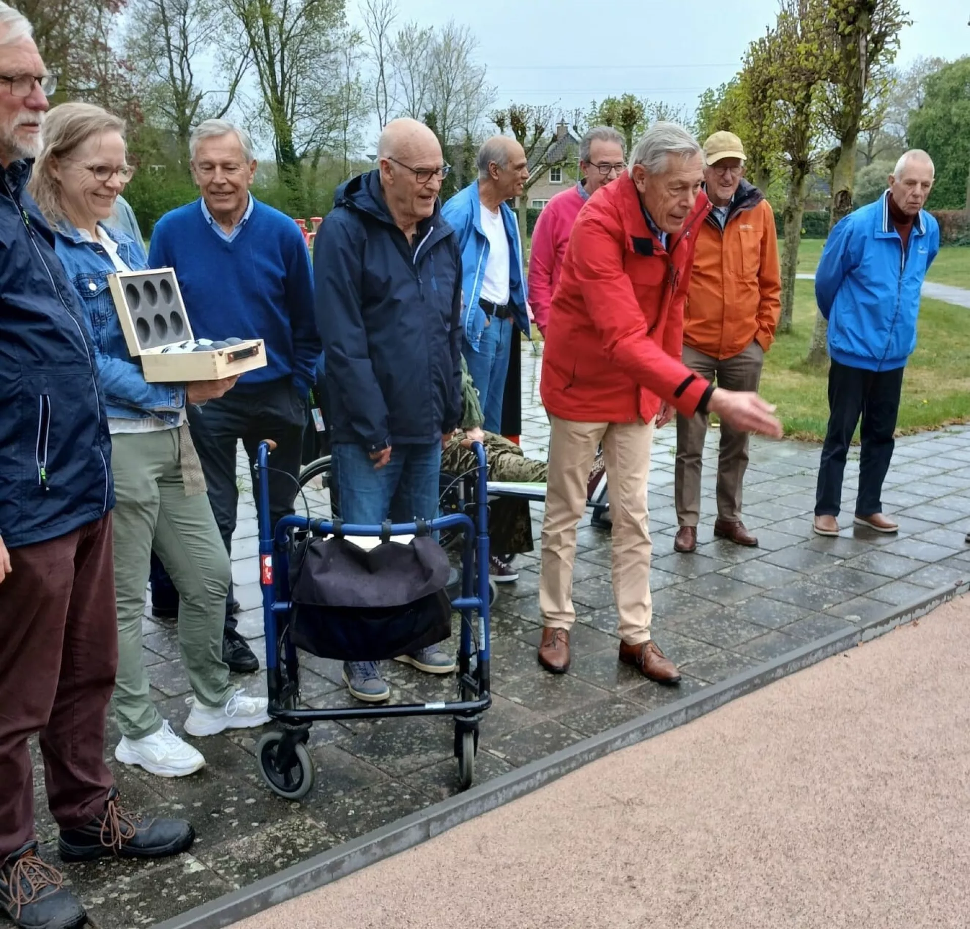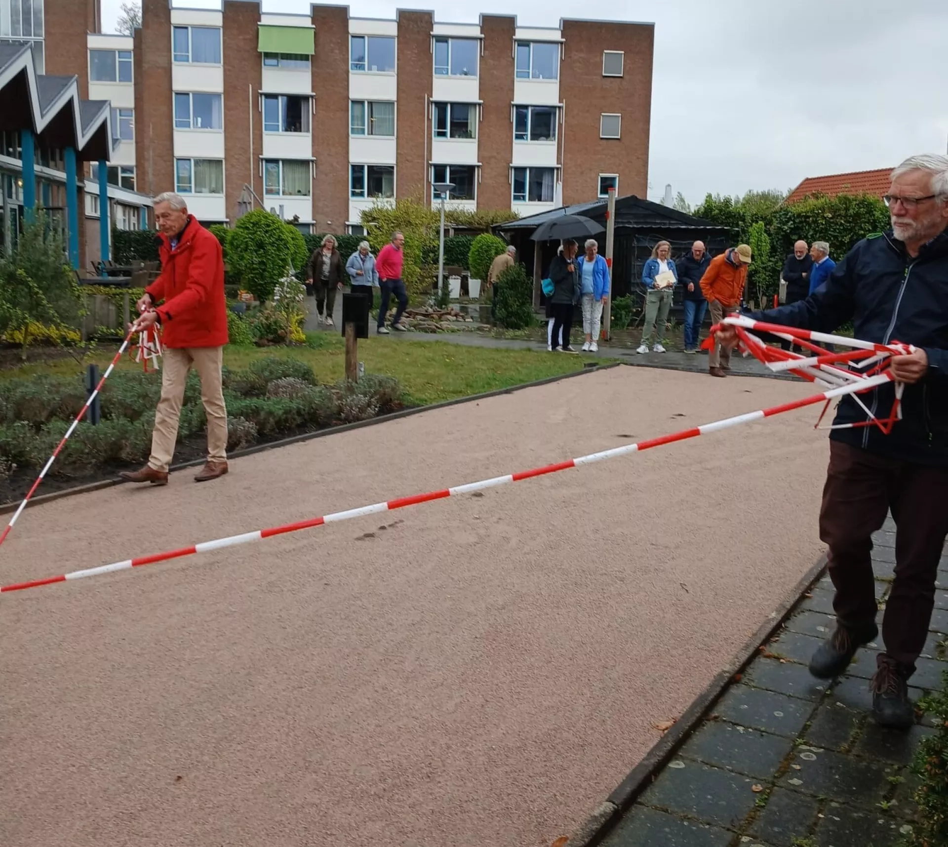 Willem Rumph en Evert Mussche, beide bestuursleden van de Steunstichting, verwijderden de rode linten en gooiden de eerste ballen. Wim, een bewoner van de Oeverlanden en fervent jeu de bouler, gaf uitleg over het spel.