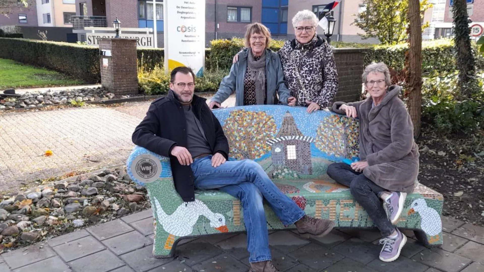 Bij de ingang van woonzorgcentrum Het Anker staat sinds deze week ook zo’n vrolijk bankje met gekleurde mozaïeksteentjes. De social sofa werd mede aangevraagd door buurman Marten die hiermee een vaste plek wil aanbieden aan de buurtbewoners die vaak bij hem ‘op bezoek komen’.