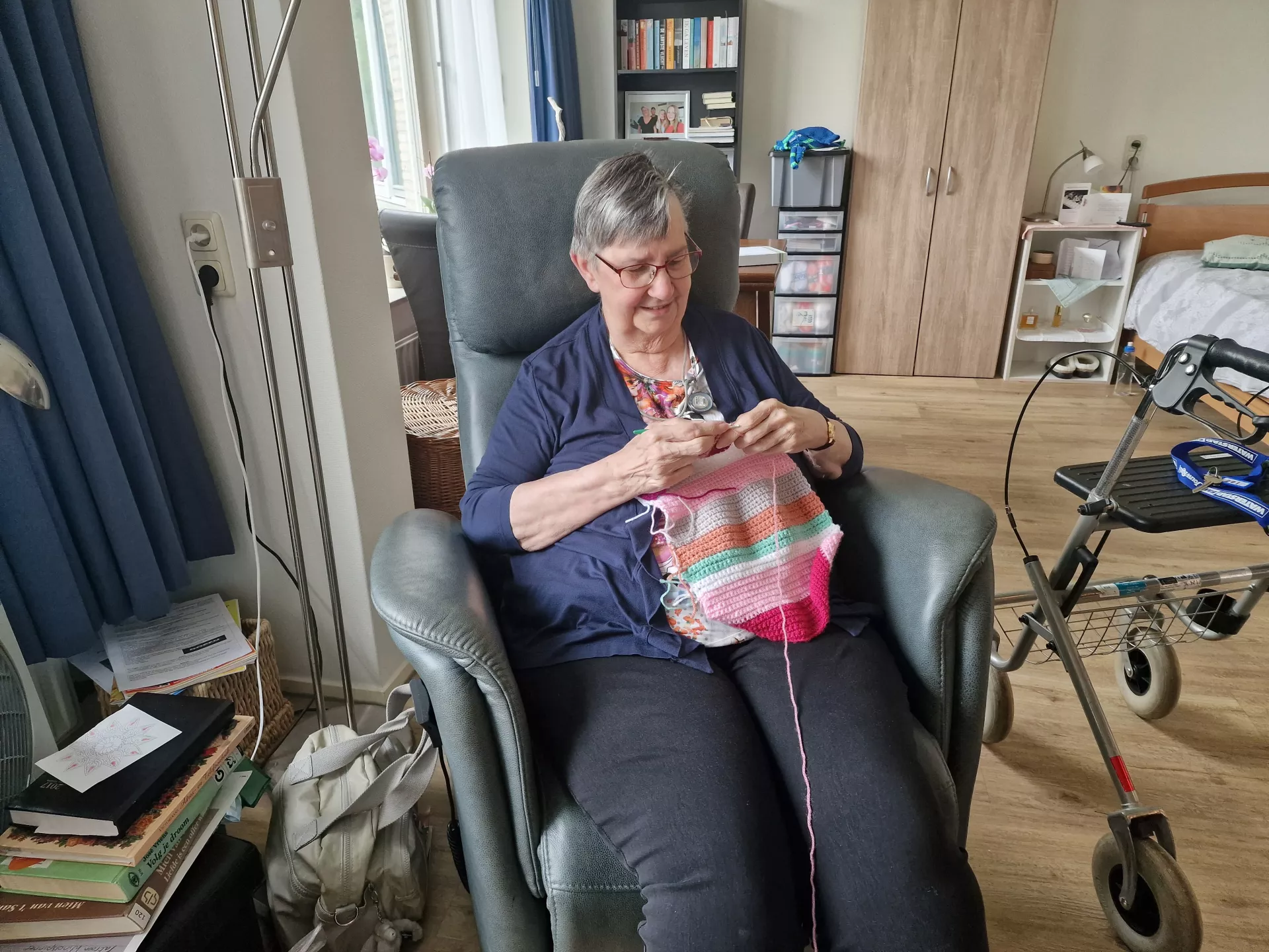 Wat vindt Tiny ervan dat er door de dag heen vaak iemand haar appartement binnenkomt om bijvoorbeeld brood te brengen, de was op te halen of schoon te maken? “Oh dat maakt me niks uit, ze kloppen altijd aan en het is ook wel gezellig als er even iemand binnenkomt.” Over de zorgmedewerkers is Tiny vol lof. "Vannacht had ik het koud en vroeg aan de zorgmedewerker die mij vanochtend uit bed hielp, of ze voor vanavond een elektrische dekentje op mijn bed willen leggen. Dat soort dingen kun je altijd aan ze vragen. Ik had afgelopen nacht natuurlijk ook gewoon iemand kunnen oproepen en vragen om een extra deken, maar ik ben niet zo’n type die voor ieder wissewasje de zorgmedewerkers belt. Ik vind dat ik mezelf moet redden zolang het lukt. Zoals de afwas wil ik ook graag zelf doen. Ik zit dan op een verrijdbare stoel en dan lukt dat nog prima. Maar ik weet dat ze meteen voor me klaar staan wanneer ik bel.”