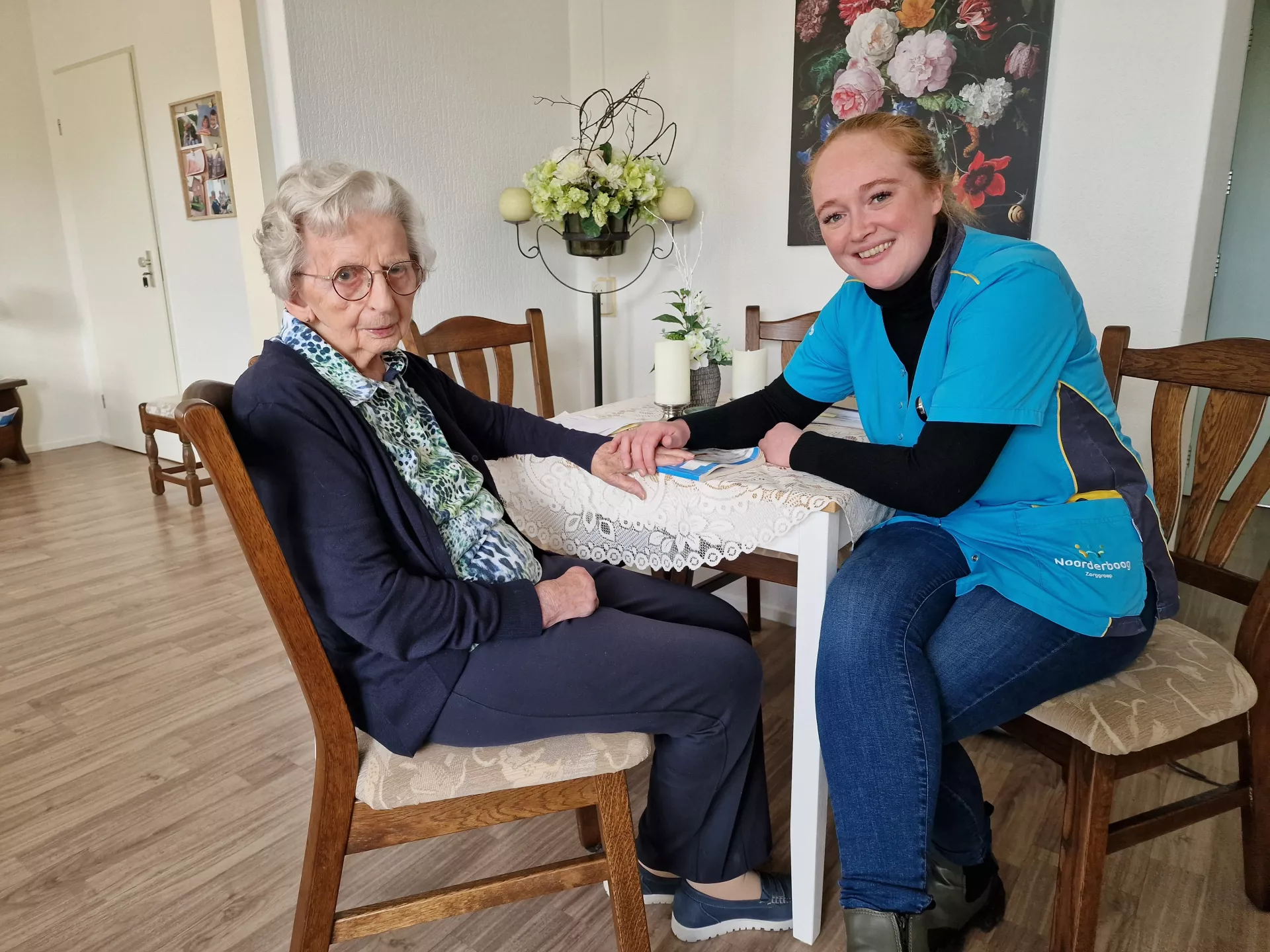 In eerste instantie zou mevrouw Schuurman-Beumer slechts tijdelijk verblijven in Het Anker om te herstellen van haar val. “Tja, hier was toen plek”, antwoordt ze op de vraag hoe ze in Het Anker in Meppel terechtkwam. Verpleegkundige Roos Strijker vult aan: “Toen mevrouw hier een tijdje was, kon ze terug naar Heerde maar na een aantal goede gesprekken met de familie en veel wikken en wegen besloot mevrouw Schuurman-Beumer om definitief in Het Anker te blijven. “Ik weet nu wat ik hier heb en zo’n mooi ruim appartement als deze vind je niet gauw ergens anders en de zorg is hier heel fijn. De medewerkers luisteren echt naar je en kijken met zorg naar je om, en niet te vergeten, het eten is hier heel erg lekker”, zo legt mevrouw Schuurman-Beumer haar keuze uit. Ook haar familie zag dat ze weer opbloeide en stonden helemaal achter haar keuze. “Het is maar een half uurtje rijden hoor mam”, zo stelde haar zoon haar gerust.